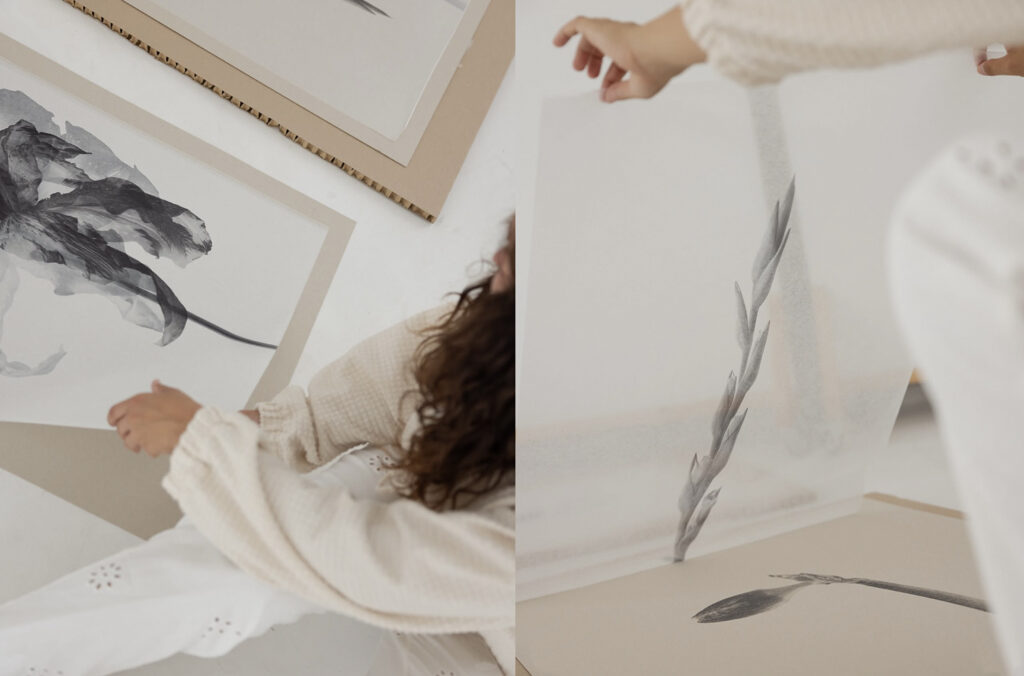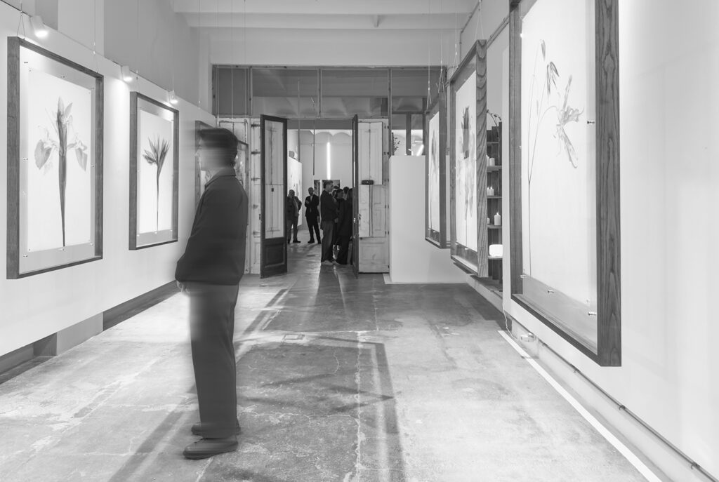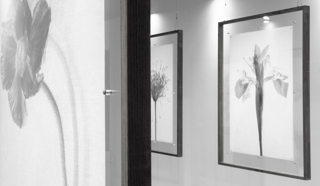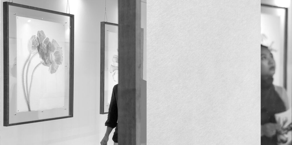 Frágil, translúcido y sensible a la luz y al tacto, el papel refleja la esencia misma de la flor. Cada imagen flota en un espacio, entre el negativo y el positivo, entre la luz y la sombra.